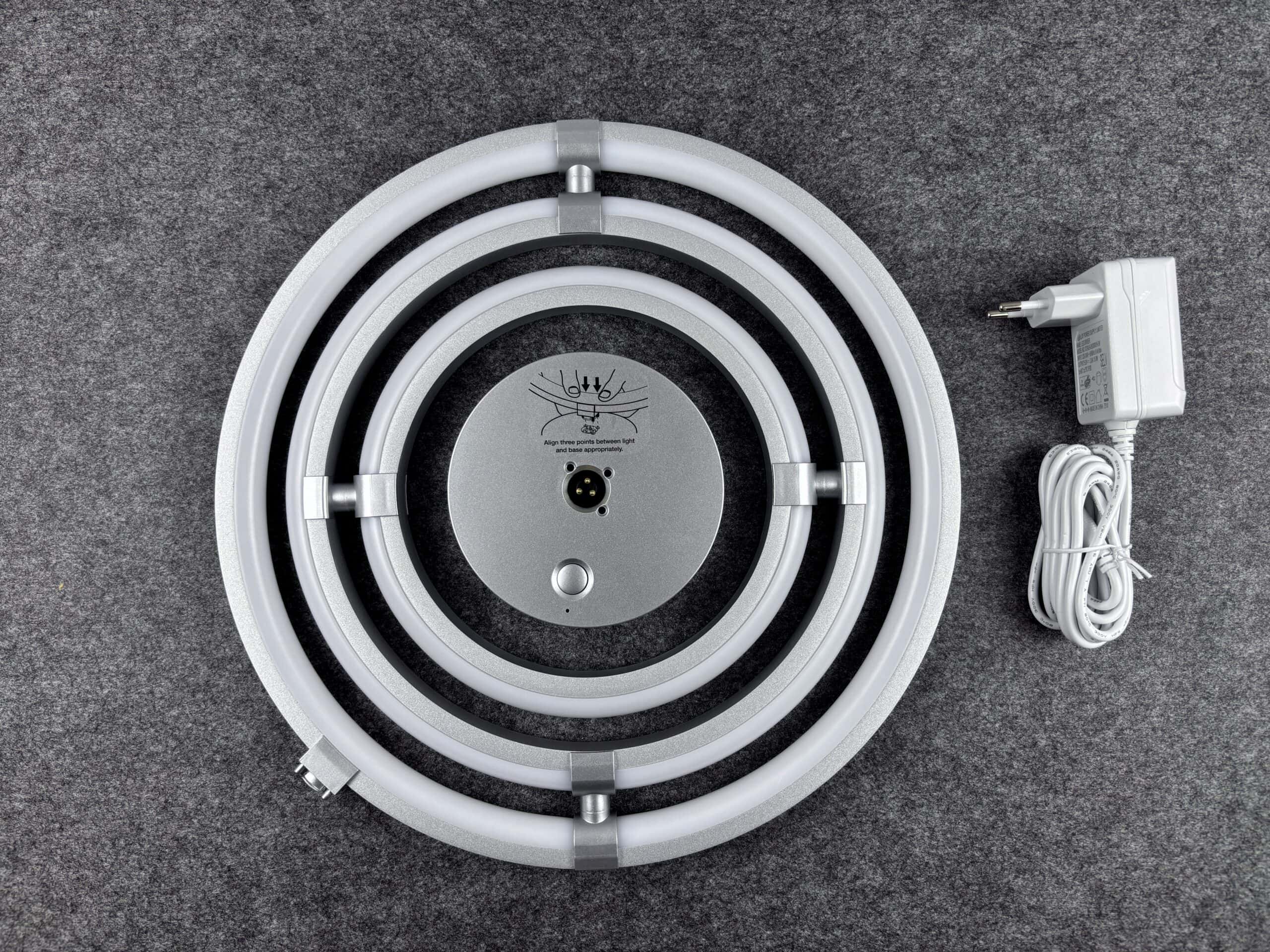 Vor der ersten Inbetriebnahme müssen die LED Ringe noch mit dem Standfuß verbunden werden. Das Einstecken erfordert etwas Kraft, da die Steckverbindungen sehr passgenau sitzen. Das Netzteil wird von hinten an die Lampe geführt, wodurch das Kabel später kaum sichtbar ist.